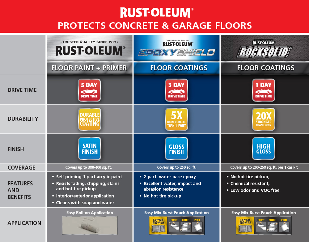Brighten your garage with a clean, glossy, showroom-quality floor that is 5 times stronger than 1-part epoxy. Rust-Oleum® EPOXYSHIELD® Garage Floor Coating Kit applies in one easy coat and protects against gasoline, antifreeze, motor oil, salt, hot tire pick-up and cracking—for years to come.