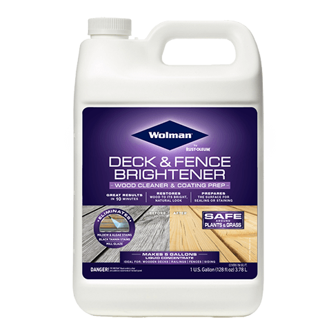 Instantly brighten decks and other exterior wood surfaces with Rust-Oleum® Wolman™ Deck & Fence Brightener Wood Cleaner & Coating Prep. This 100% biodegradable formula applies easily, clings to vertical surfaces and lifts dirt in just 10 minutes.