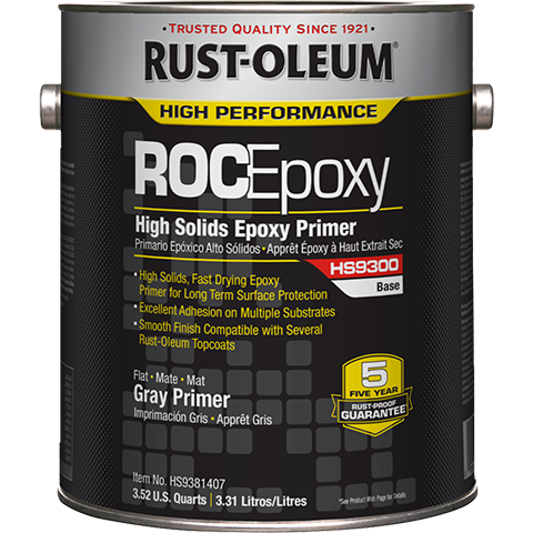ROCEpoxy High Solids Epoxy Primer HS9300 is a fast drying, two-component product designed to be part of a coating system for superior corrosion protection. This high solids, rust-inhibitive primer can be applied to clean, abrasive blasted steel or slightly rusted steel, masonry or concrete. It can be top-coated with several Rust-Oleum Industrial products including ROCEpoxy Direct-to-Metal Epoxy Mastic 9100, ROCThane Fine Finish Urethane 9400 and ROCThane Direct-to-Metal Urethane Mastic 9800.