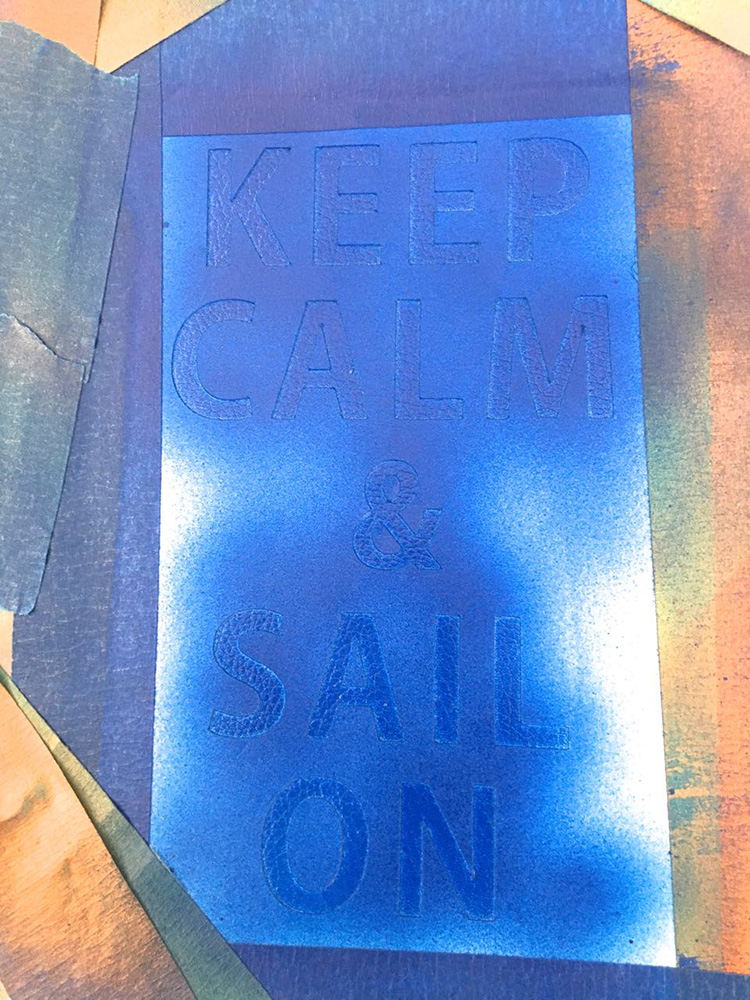 - Print out the “Keep Calm…” message on card stock in bold letters to create a stencil. The entire message should be no larger than 3” wide and 5” long. Cut out the letters with a craft knife. Apply adhesive to the back and press the stencil to the bag front beneath the pocket.