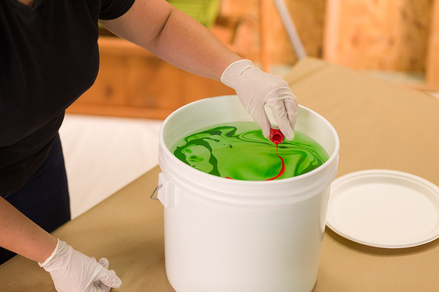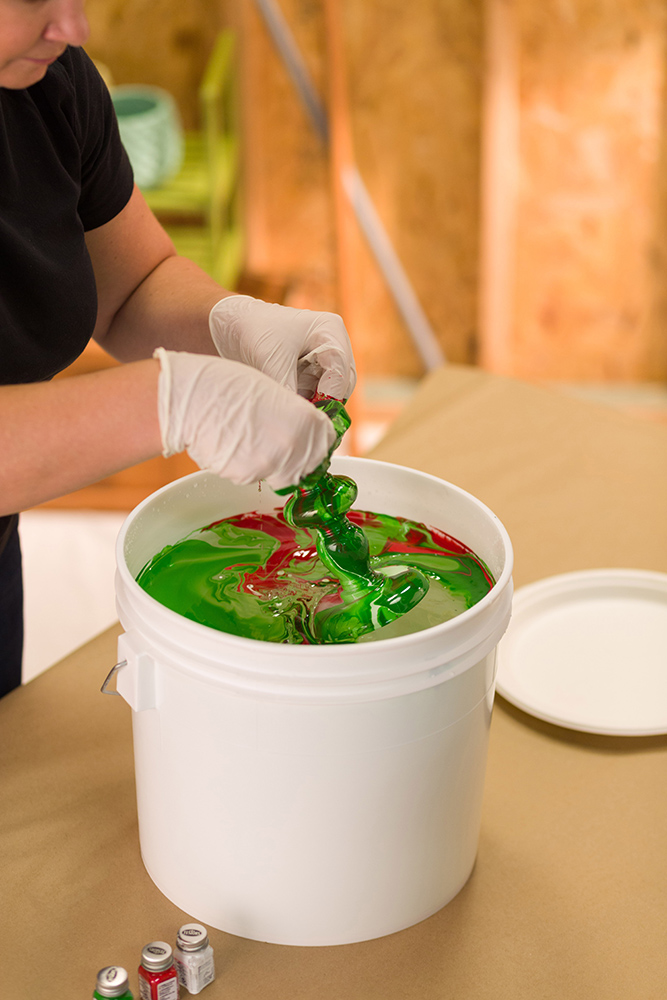 Once all of your enamel paint colors are in the bucket, use a coffee stir stick and slowly drag it across the colors to swirl them together.