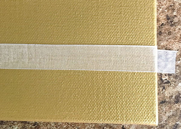 Position a piece of ribbon 1.25” from the bottom of the canvas. Hot glue the ends of the ribbon on the canvas sides and then on the pack. Cut off excess.