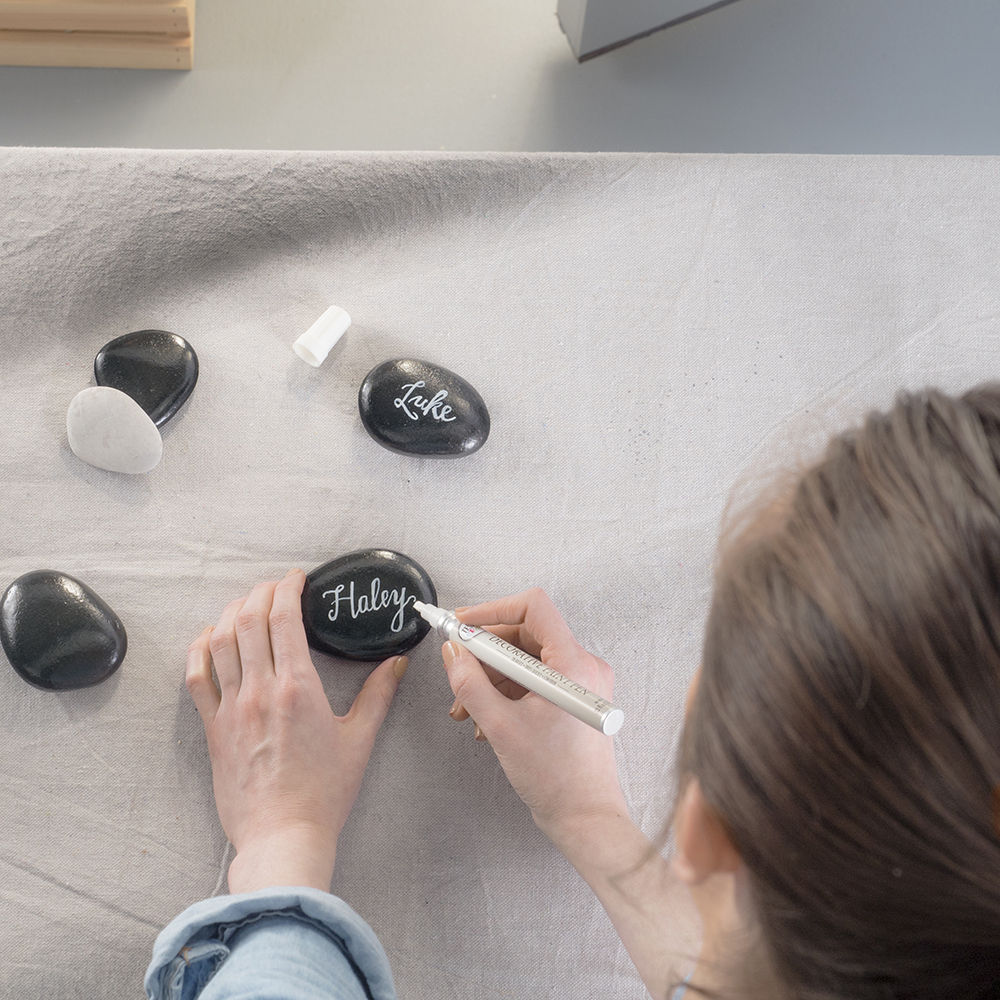 - Let the paint dry completely before switching sides, and once both sides are dry, use the enamel marker to hand-write names on each one.
